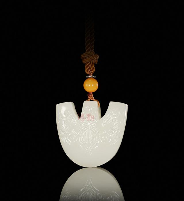 玉质洁白,形制新颖,作为挂件有着让人眼前一亮的奇趣魅力。正面以神秘、古朴的纹饰来象征太阳,寓意“被强大具有威势的力量所护佑”。款识:腾