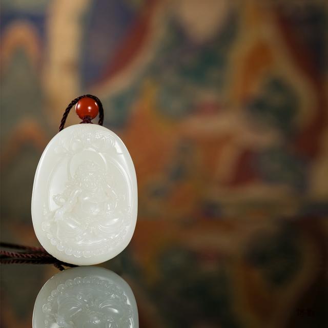 黄财神是藏传佛教各大教派普遍供养的五姓财神之首,主司财富,能使一切众生脱于贫穷,因其身相黄色,故名黄财神。作品圆润饱满,黄财神头戴宝冠,怒目圆睁,丰髯有威,其凛然威严之神态令人心生敬畏,头上的大鹏展翅鸟,既是护法,更能衬托黄财神的威严。作者纯熟的浮雕技法彰显其立体感,整体风格刚劲硬朗,韵致雄浑大气。款识:永昌