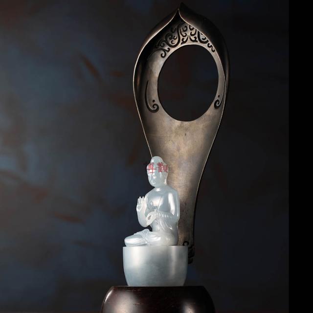 此件拍品选取了一块质地洁净均匀、白中微微泛紫的冰种翡翠,以简约大气的手法雕琢出一尊结跏趺坐双手结说法印的佛祖。佛祖身形衣饰表现出典型的魏晋石窟佛造像风格,秀骨清姿、衣纹简洁而流畅贴身。佛祖坐下的莲台被极度简化,不事雕琢,而是以艺术化的手法将佛祖背后的背光幻化成金属铸造的莲瓣造型。拍品充分体现出现代艺术精神对传统佛教造型的独到理解。