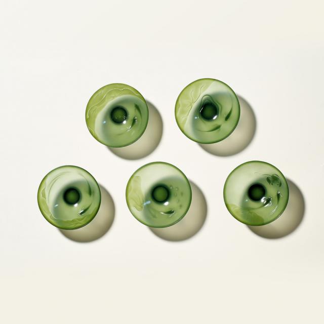 本件作品由青玉雕琢而成,五件茶盏取自同一原料,薄如蝉翼可见作者工艺之精湛,作者巧妙利用材料中杂质雕作荷叶,游鱼身姿修长,怡然自得,遨游于流水之中,子非鱼亦可见鱼之乐。