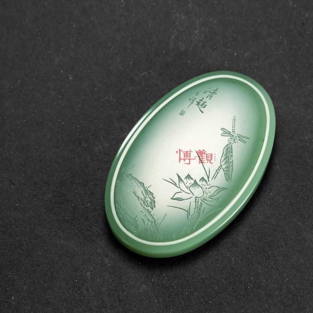 此件作品采用析木玉雕刻而成,玉质细腻干净,莹润如脂,色泽淡雅均匀。牌型圆润,线条流畅。作品正面取荷塘一角,雕就亭亭玉立之荷花,线条舒朗有致,深浅不一。一只蜻蜓立于荷尖,徘徊不去,荷花盛放之姿已现凋零之意,留白之处亦显清幽。背面以阴刻技法雕刻明代诗人文征明《钱氏池上芙蓉》中的诗句“露洗玉盘金殿冷, 风吹罗带锦城秋。相看未用伤迟暮, 别有池塘一种幽。”诗画结合,意境幽雅,别有一番情趣。款识:青山